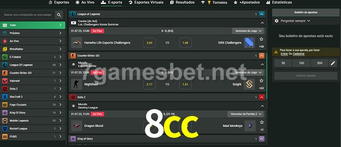 A aposta 8cc oferece aos jogadores a experiência mais conveniente de apostas em eSports!